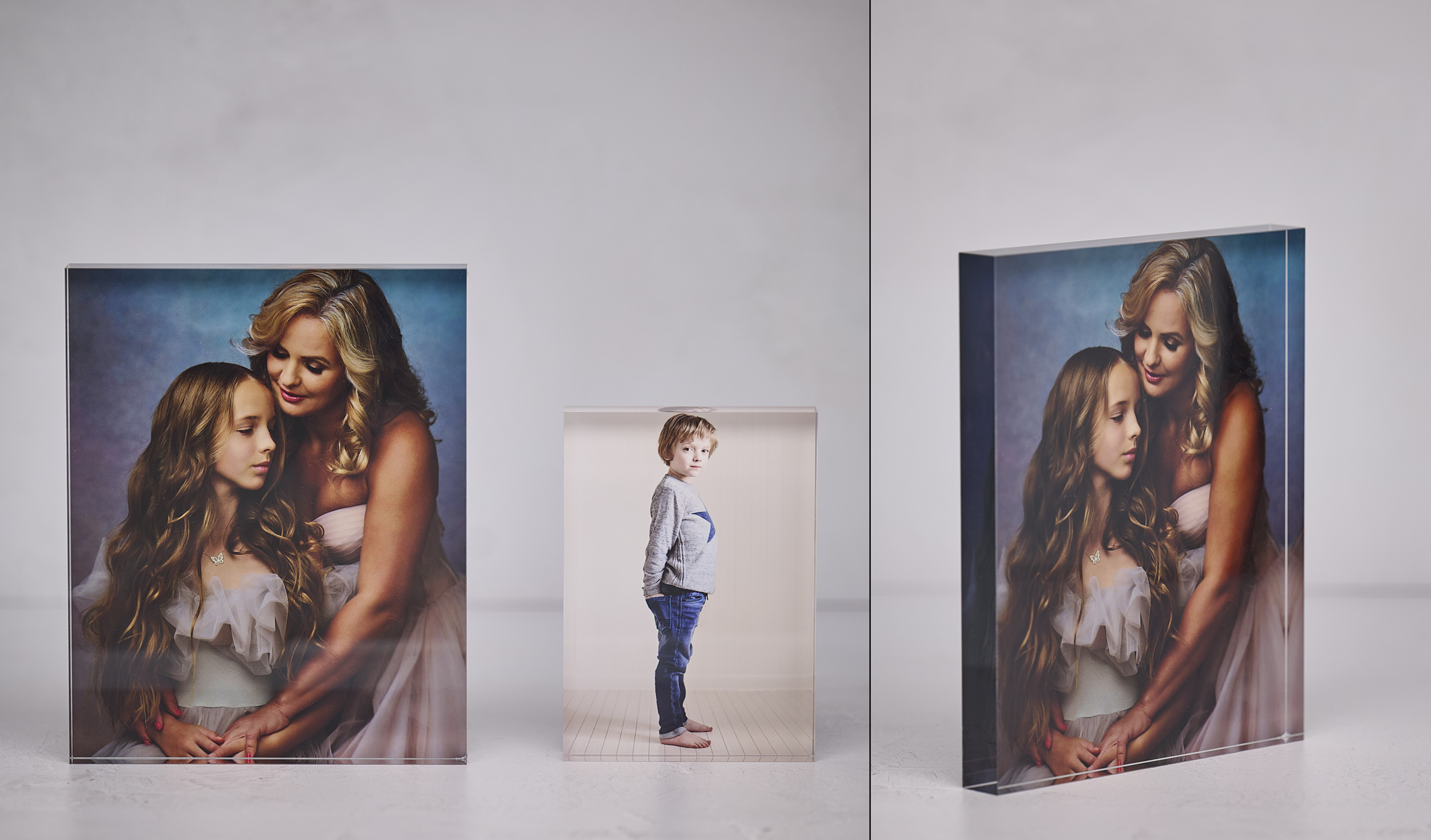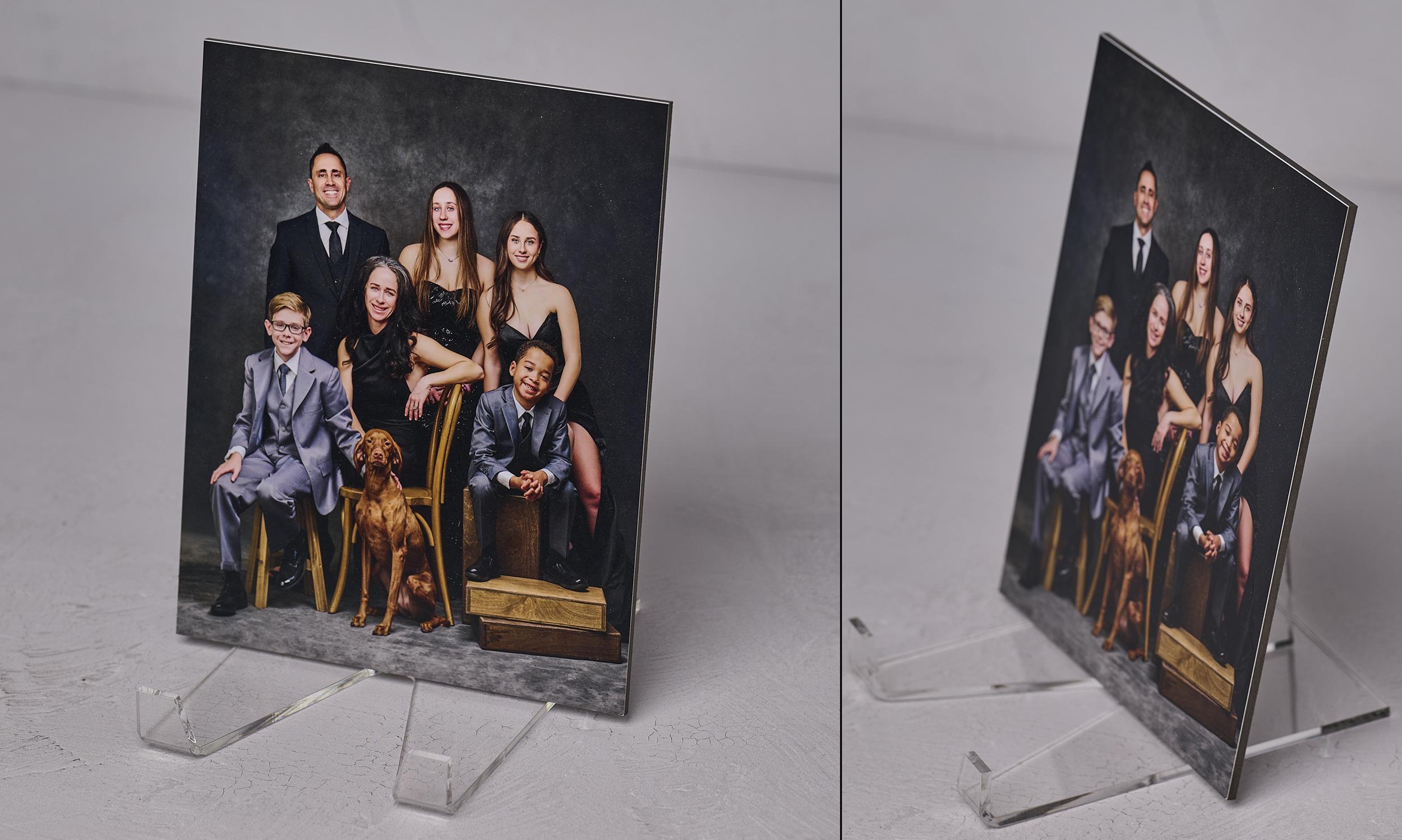 For a bold, contemporary look, our acrylic frameless prints offer vibrant color and striking clarity. These pieces appear to float on your walls, adding a touch of modern sophistication that transforms your portraits into statement art.